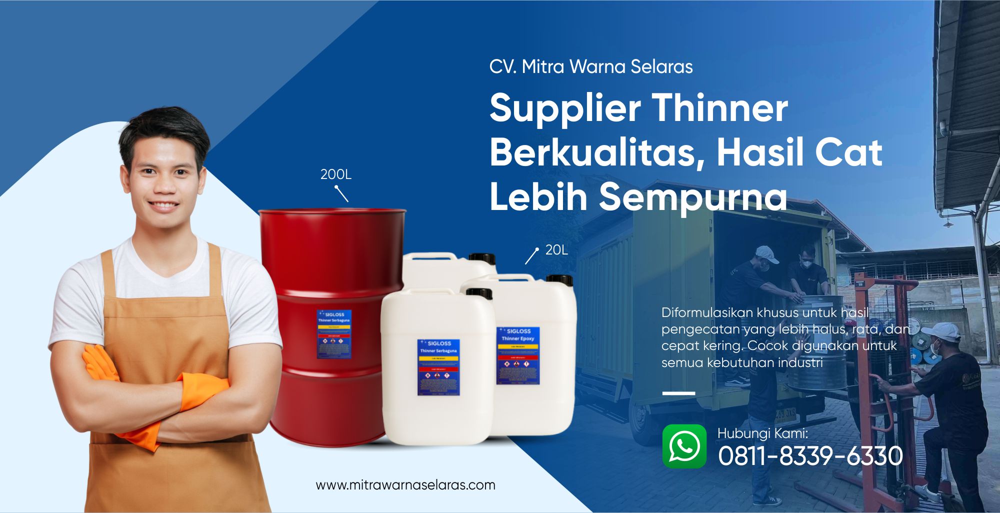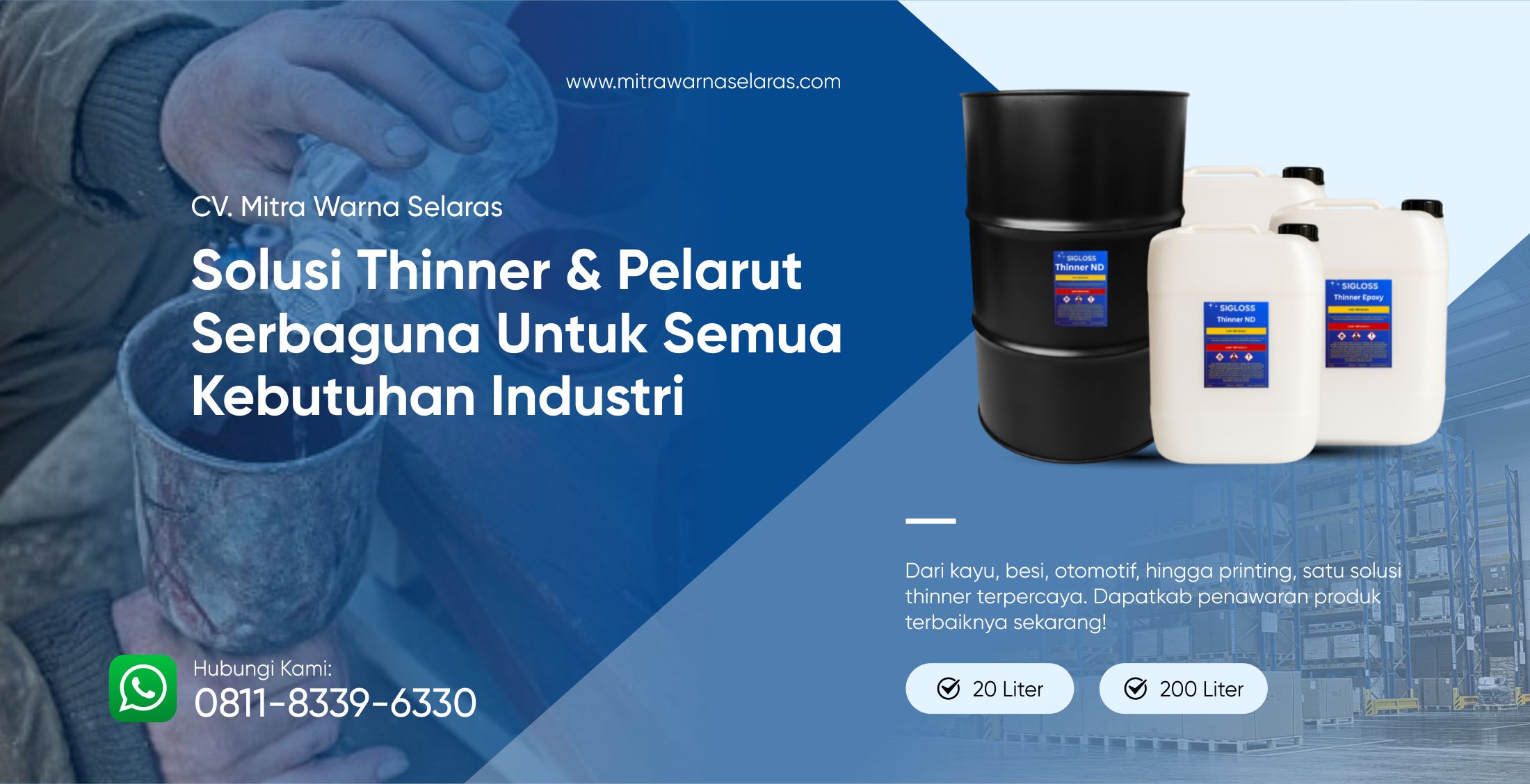 CV Mitra Warna Selaras telah berdiri sejak tahun 2009 dan berfokus pada produksi thinner/pelarut untuk memenuhi kebutuhan berbagai industri. Dengan dukungan tenaga kerja profesional serta komitmen pada prinsip kerja keras dan kejujuran, perusahaan terus menjaga kualitas produk sekaligus menghadirkan harga yang kompetitif.